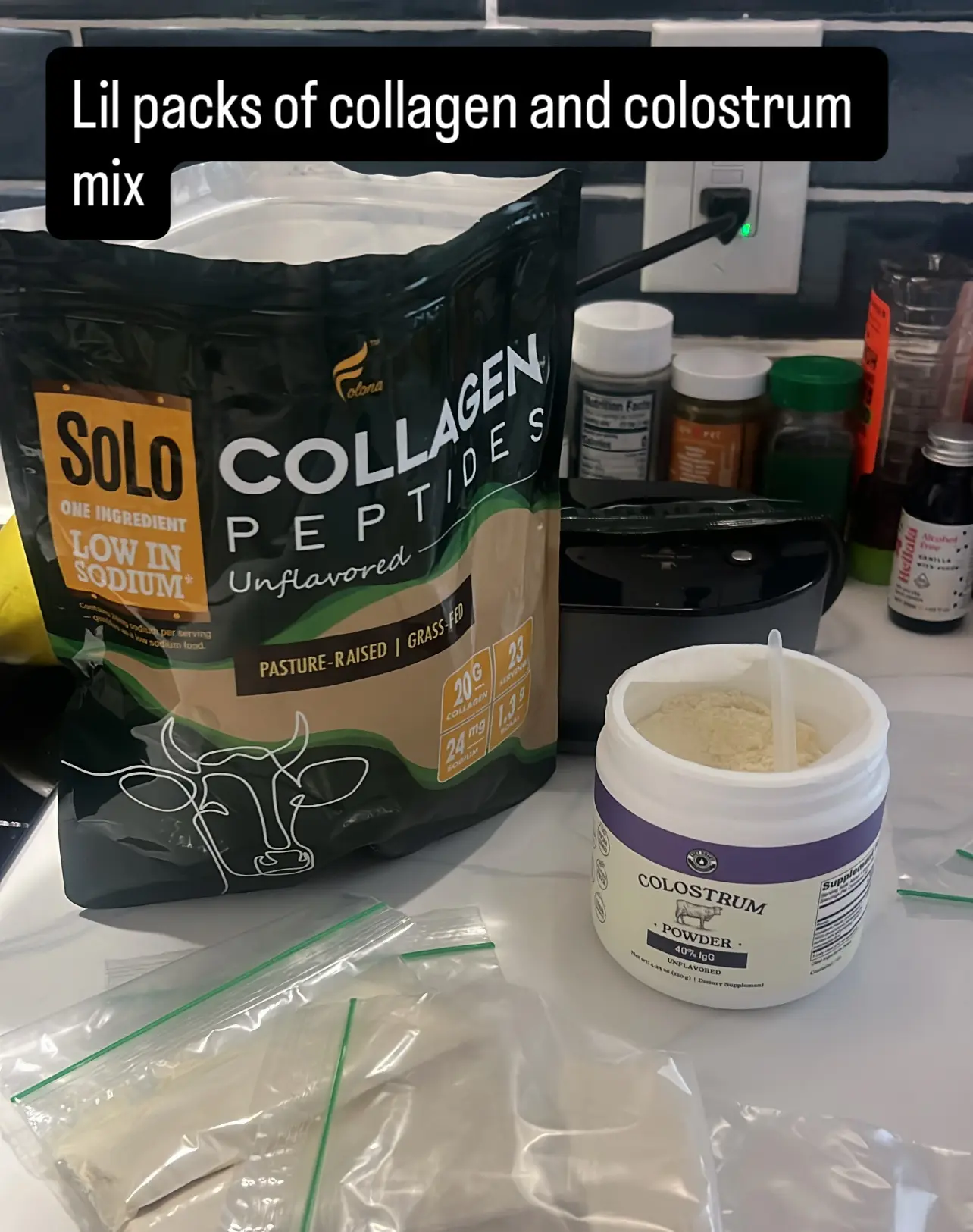 I’ve tried a few different brands in the past. One of them was Vital Protein’s collagen powder, 20 gr per serving. I currently use Orgain’s collagen powder, which also provides 20 grams peptides per serving, and it is also more affordable than Vital Proteins’ collagen powder. If you are in search of a good collagen powder, get one that provides 20 gr collagen per serving. I ve been also prepping little packs of collagen and colostrum mix. It’s much easier for me to consume this way – see the image below.